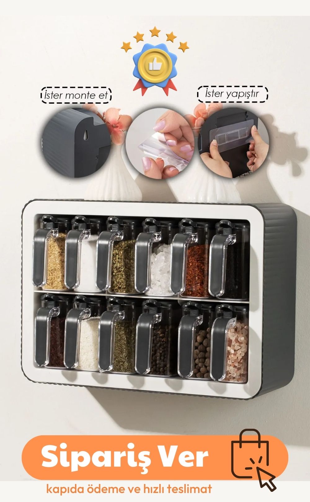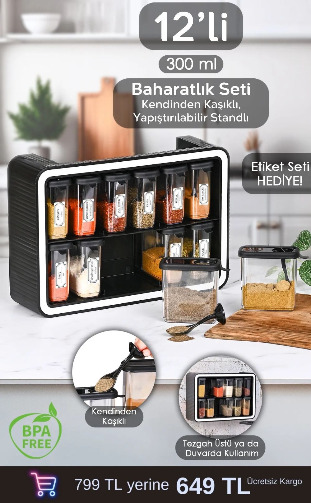 Elinizdeki bu 12'li baharatlık seti, mutfağınıza hem şıklık hem de işlevsellik kazandıracak! Gıda temas yönetmeliğine uygun olarak üretilen set, 14x34x24 cm ölçülerindedir ve her bir baharat kabı 250 ml kapasiteye sahiptir. Ergonomik tasarımı sayesinde baharatlara hızlıca ulaşabilir, çift taraflı bant ile seti istediğiniz yüzeye güvenle yapıştırabilirsiniz.